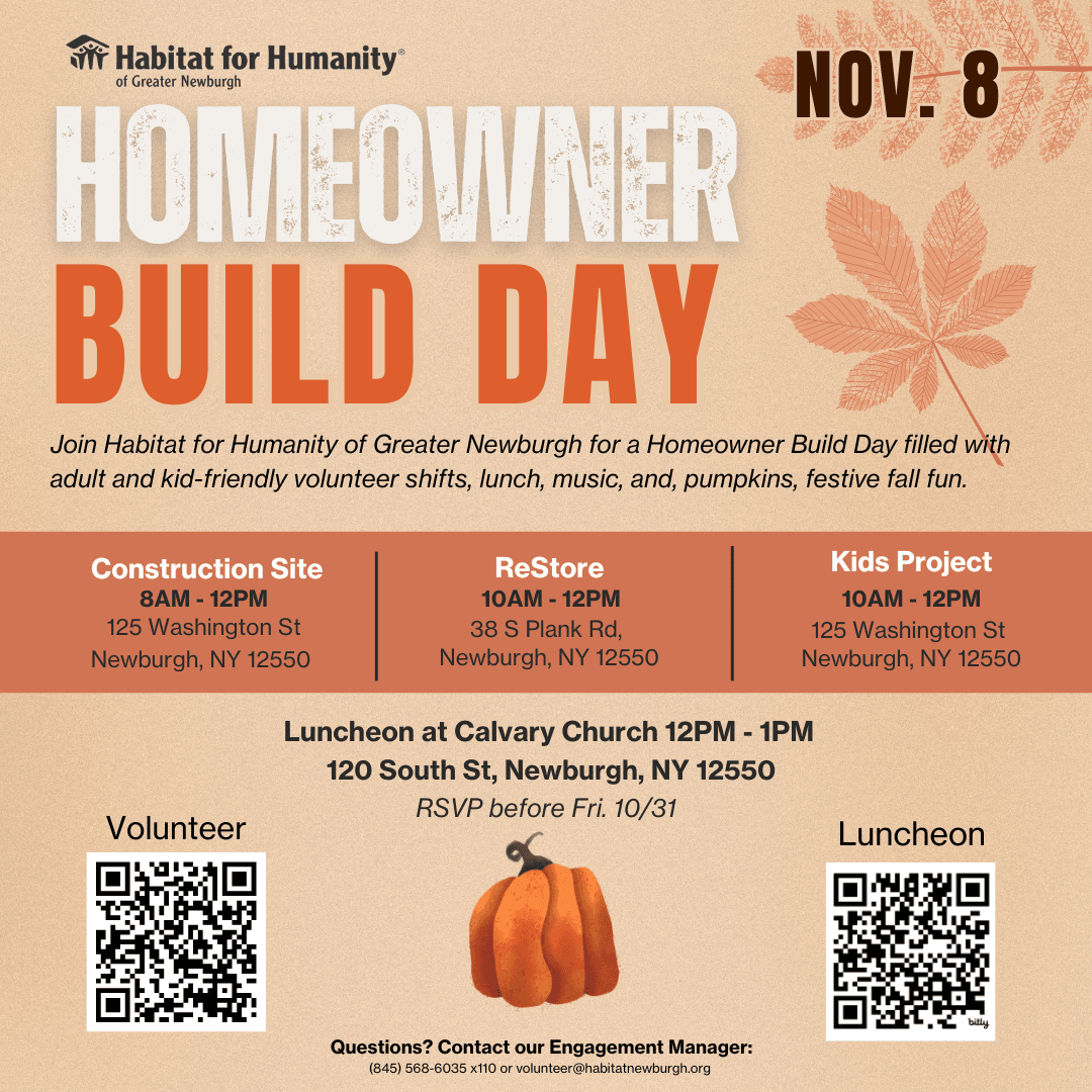 Join Habitat for Humanity of Greater Newburgh for our 2025 Homeowner Build Day filled with adult and kid-friendly volunteer shifts, lunch, music, and, pumpkins, festive fall fun.