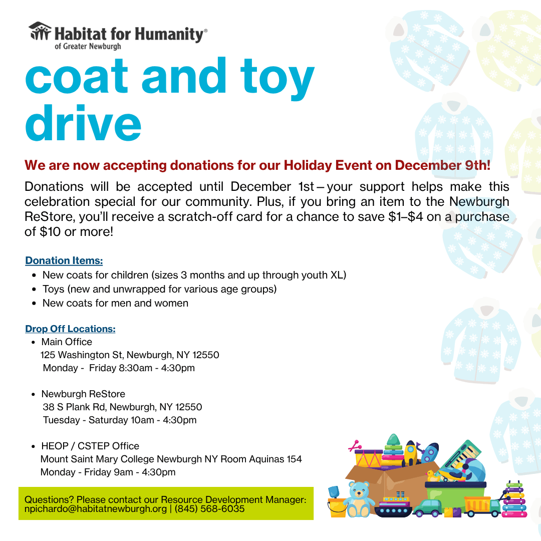 Donations will be accepted until December 1st—your support helps make this celebration special for our community. Plus, if you bring an item to the Newburgh ReStore, you’ll receive a scratch-off card for a chance to save $1–$4 on a purchase of $10 or more!