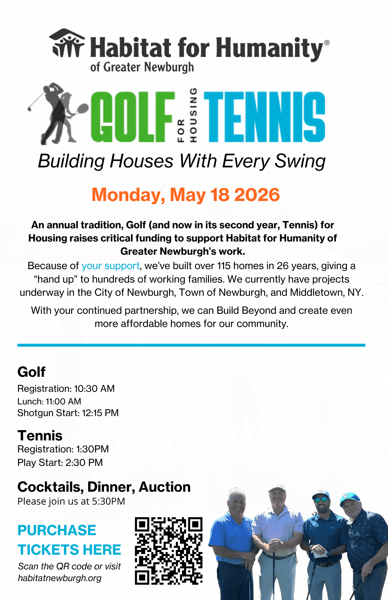 An annual tradition, Golf, and now in its second year, Tennis for Housing raises critical funds to support Habitat for Humanity of Greater Newburgh. Thanks to your support, we’ve built over 115 homes in 26 years, giving a “hand up” to hundreds of working families.
