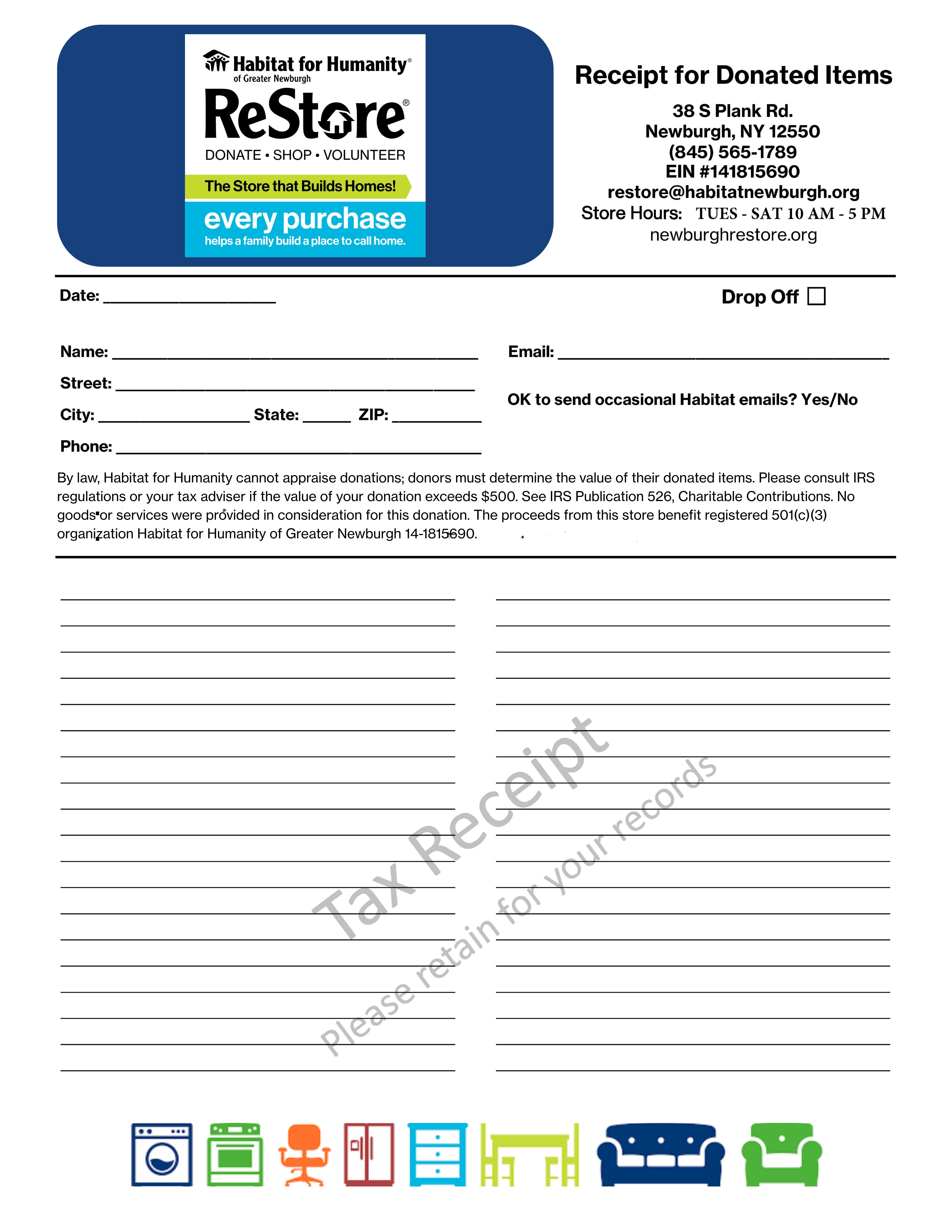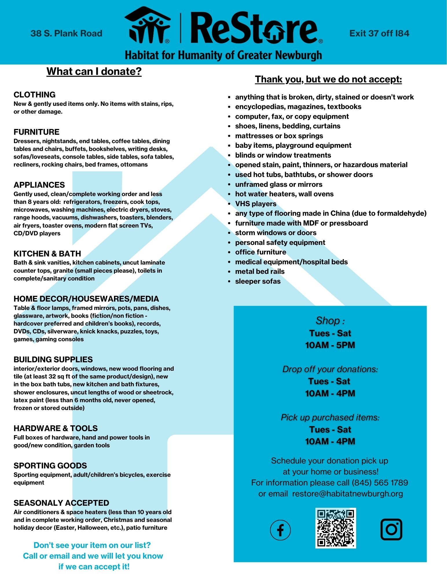 Please email photos of the items you would like to donate - this will help expedite the process. You can send photos to restore@habitatnewburgh.org, please include in your email your name, address, contact phone number - confirm all items are in clean/gently used condition and will be located in your garage, driveway, parking space or loading dock area for the day-of pick up.